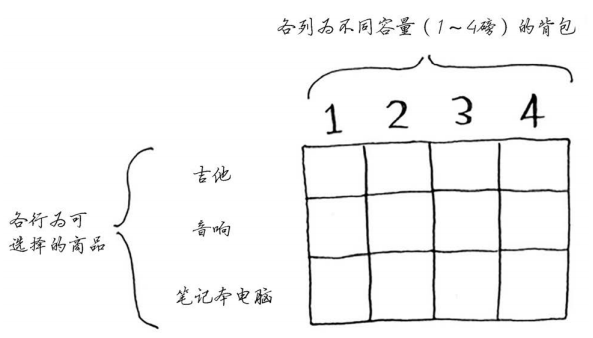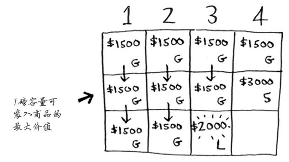 网格的各行为商品,各列为不同容量(1~4磅)的背包。所有这些列你都需要,因为它们将帮助你计算子背包的价值。