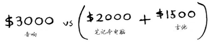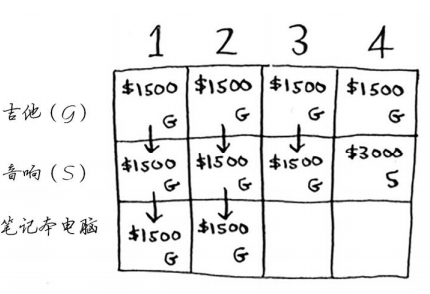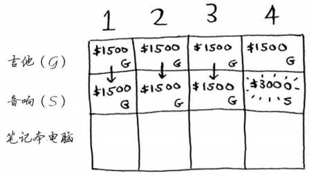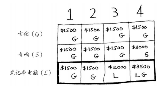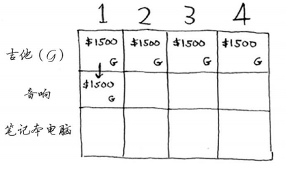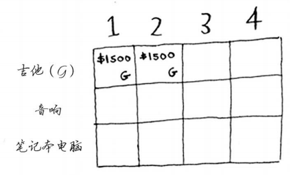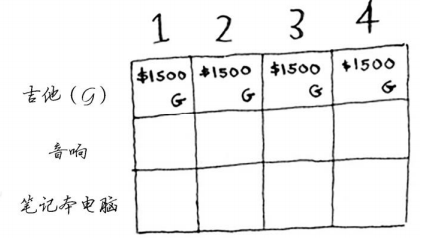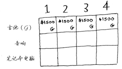 答案会随之变化吗?假设你按如下顺序填充各行:音响、笔记本电脑、吉他。网格将会是什么样的?请自己动手填充这个网格,再接着往下读。网格将类似于下面这样。