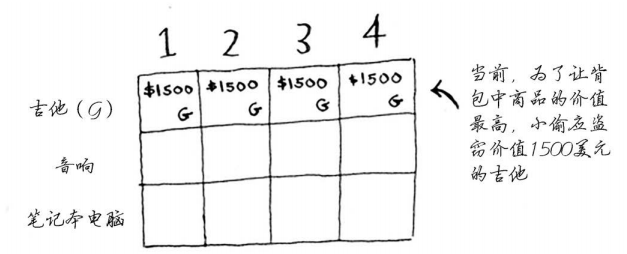 对于容量为3磅的背包,原来的最大价值为1500美元,但现在你可选择盗窃价值2000美元的笔记本电脑而不是吉他,这样新的最大价值将为2000美元!