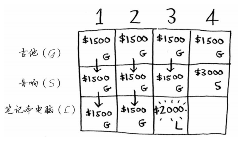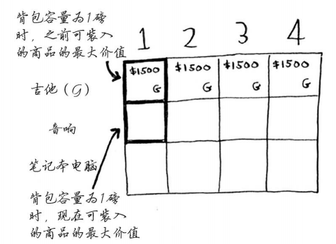 第一个单元格表示背包的容量为1磅。吉他的重量也是1磅,这意味着它能装入背包!因此这个单元格包含吉他,价值为1500美元。