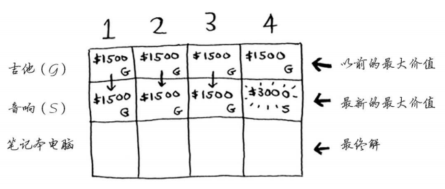 你更新了最大价值!如果背包的容量为4磅,就能装入价值至少3000美元的商品。在这个网格中,你逐步地更新最大价值。