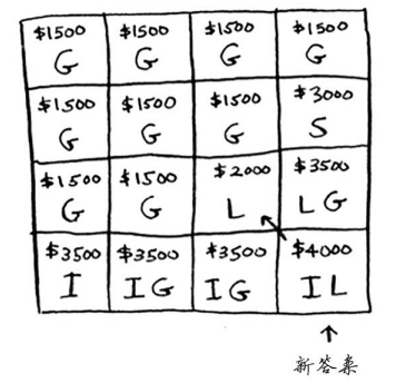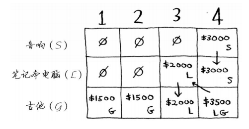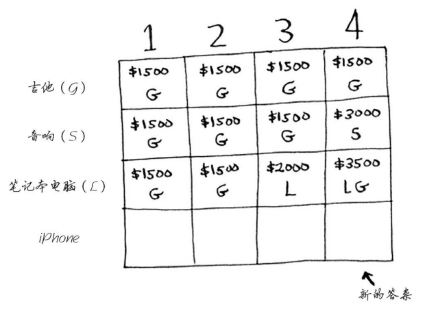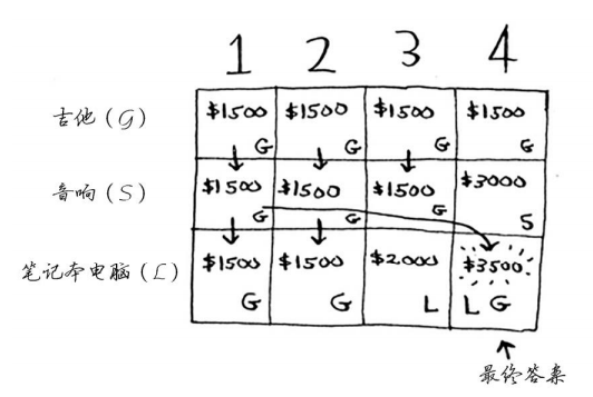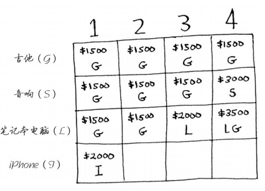 你可能始终心存疑惑:为何计算小背包可装入的商品的最大价值呢?但愿你现在明白了其中的原因!余下了空间时,你可根据这些子问题的答案来确定余下的空间可装入哪些商品。笔记本电脑和吉他的总价值为3500美元,因此偷它们是更好的选择。最终的网格类似于下面这样。