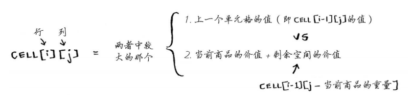 - 单元格中的值通常就是你要优化的值。在前面的背包问题中,单元格的值为商品的价值。