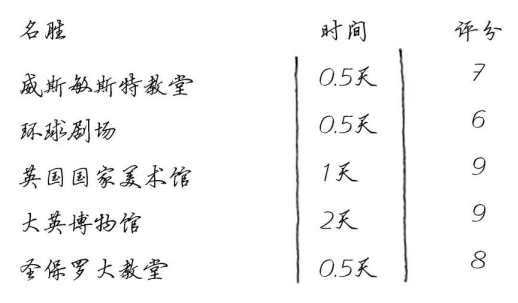 对于想去游览的每个名胜,都列出所需的时间以及你有多想去看看。根据这个清单,你能确定该去游览哪些名胜吗?