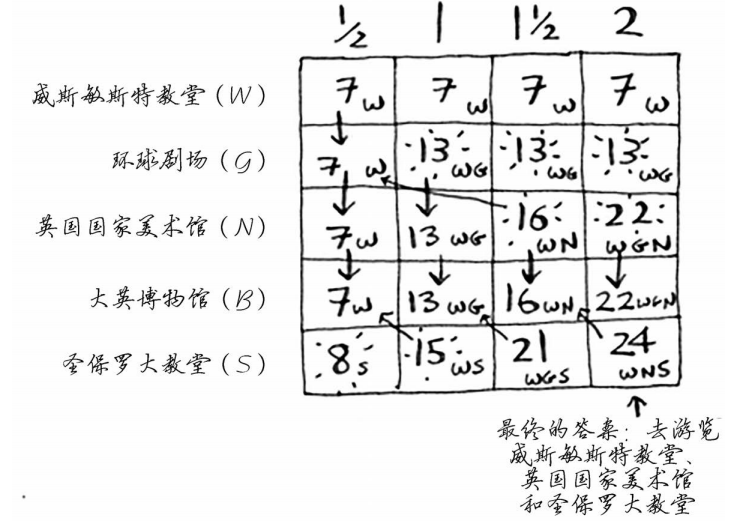 这也是一个背包问题!但约束条件不是背包的容量,而是有限的时间;不是决定该装入哪些商品,而是决定该去游览哪些名胜。请根据这个清单绘制动态规划网格,再接着往下读。