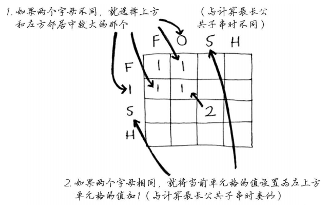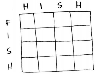 如何将这个问题划分为子问题呢?你可能需要比较子串:不是比较hish和fish,而是先比较his和fis。每个单元格都将包含这两个子串的最长公共子串的长度。这也给你提供了线索,让你觉得坐标轴很可能是这两个单词。因此,网格可能类似于下面这样。