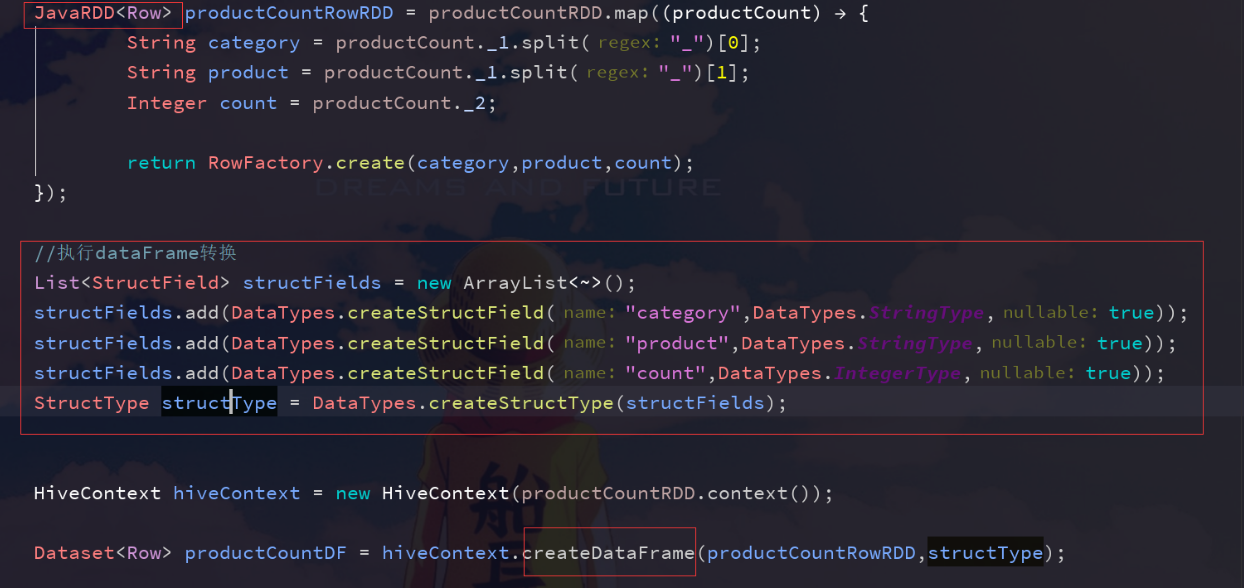 //一、创建普通的RDD,但要转换为RDD<row>的格式