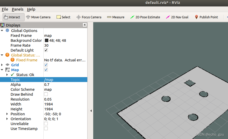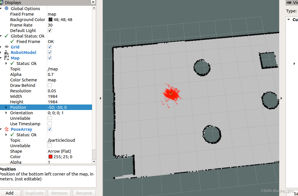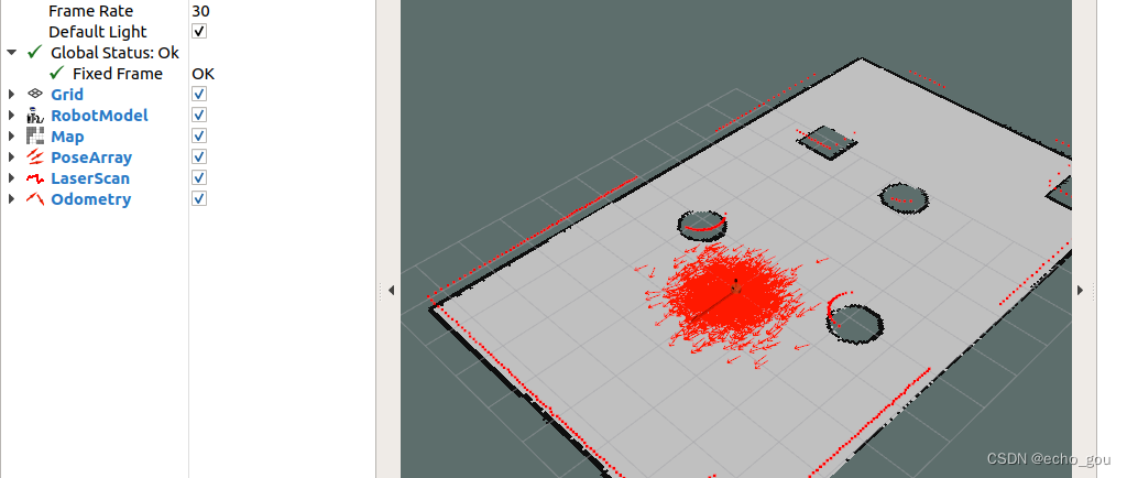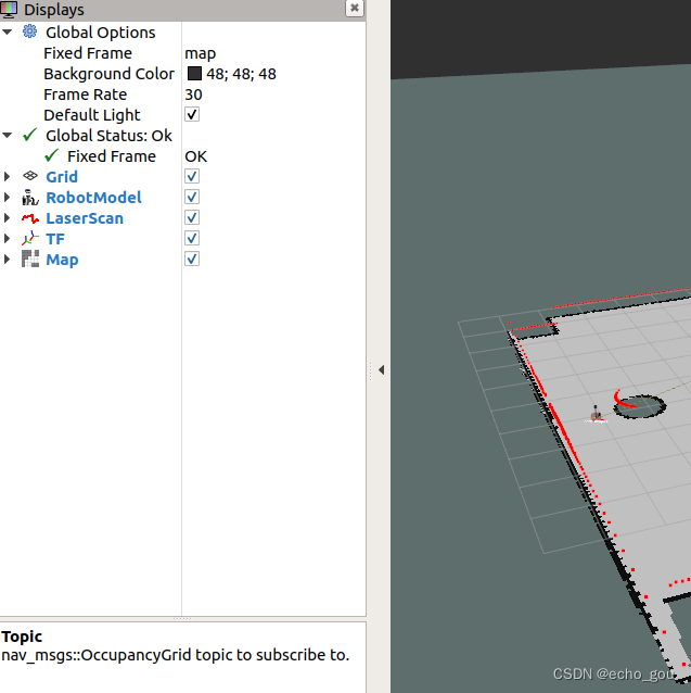 5.在 rviz 中添加组件,显示栅格地图最后,就可以通过键盘控制gazebo中的机器人运动,同时,在rviz中可以显示gmapping发布的栅格地图数据了,但是,前面也介绍了,由于精度和检测范围的原因,尤其再加之环境的特征点偏少,建图效果可能并不理想,建图中甚至会出现地图偏移的情况。