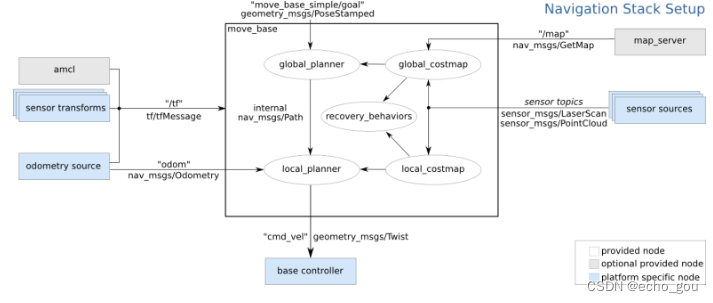 ROS 官方为了提供了一张导航功能包集的图示,该图中囊括了 ROS 导航的一些关键技术