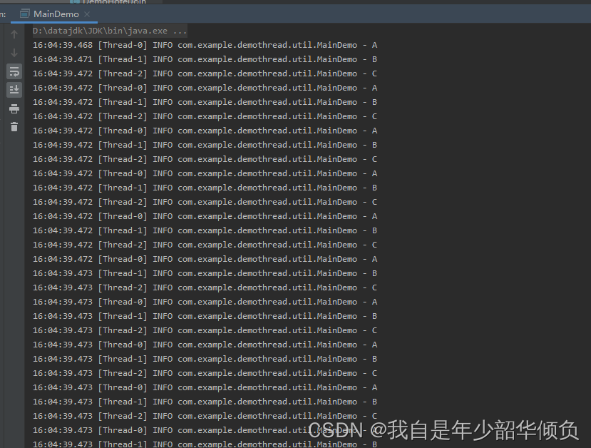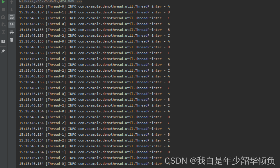 ThreadA 表示使用了lock.lock获取到了锁,这样如果其他对象再次使用lock.lock()的时候会被阻塞住,当依次循环打印完毕之后,会调用lock.unlock() 释放锁,这样别线程等待的时候就会获取到锁,从而实现顺序轮询打印