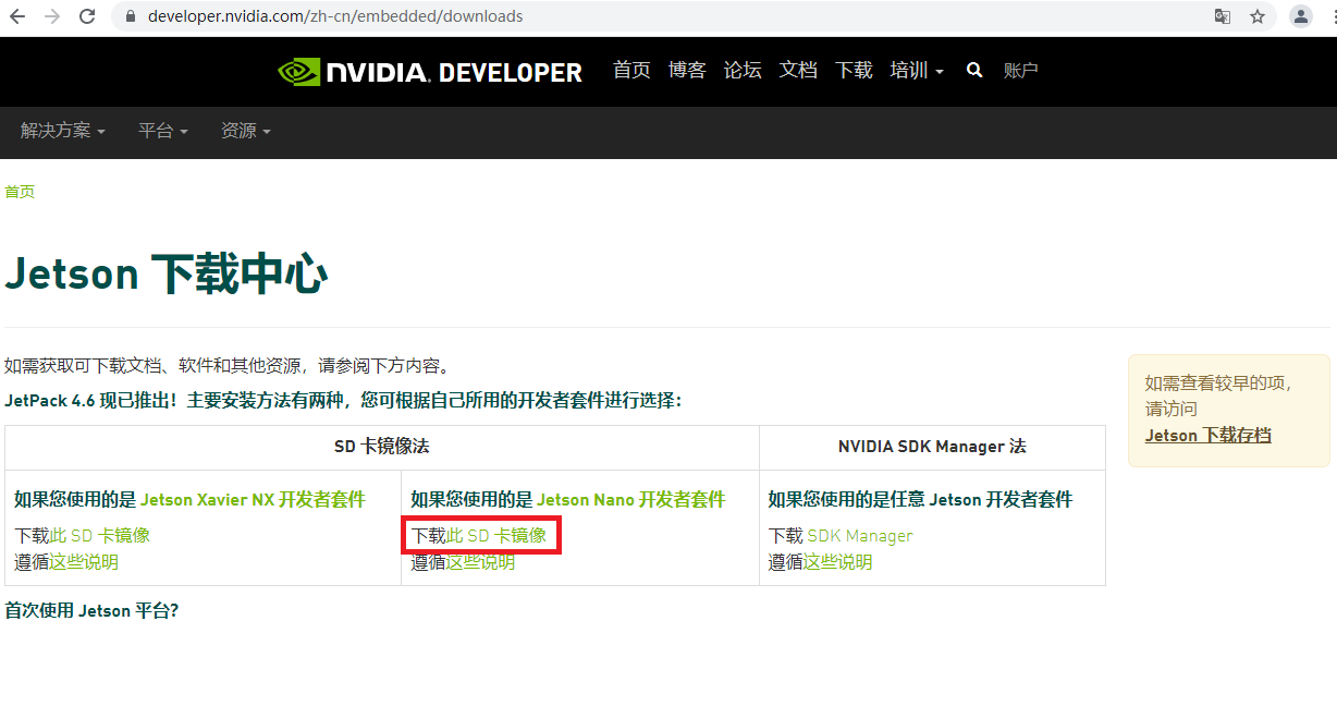 在使用开发套件之前,SD卡要烧写好操作系统,以及JetPack工程所需的其他组件。首先下载官方提供的Jetsonnano镜像文件,下载地址: