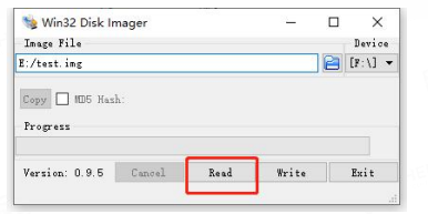3.3镜像拷贝打开win32Disk软件,选中刚刚新建的空白img文件,然后点击“read”。
