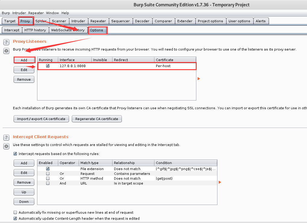 2.1、在Kali虚拟机中打开Burp Suite工具并设置,打开“Proxy”选项卡,选中“Options”子选项卡,单机“Add”按钮,增加一个监听代理,设置为127.0.0.1:8080;