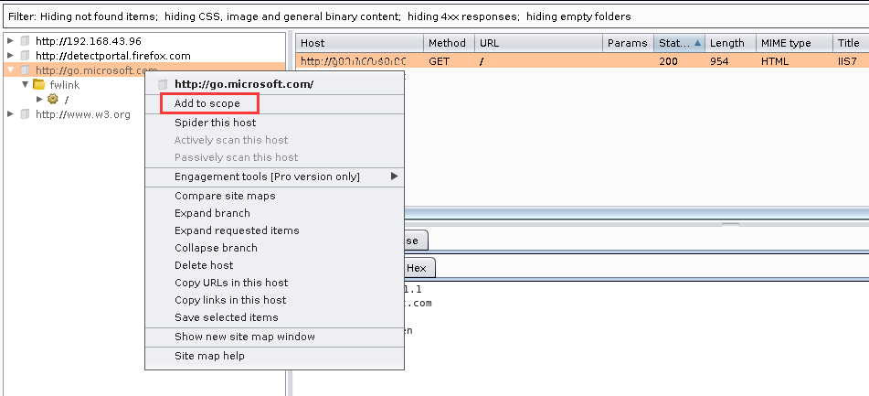 注:根据图中的相关联网址,右击左边树形结构中的某个网址,在弹出的快捷菜单中选择Add to scope命令,即把某个网站设置到目标范围