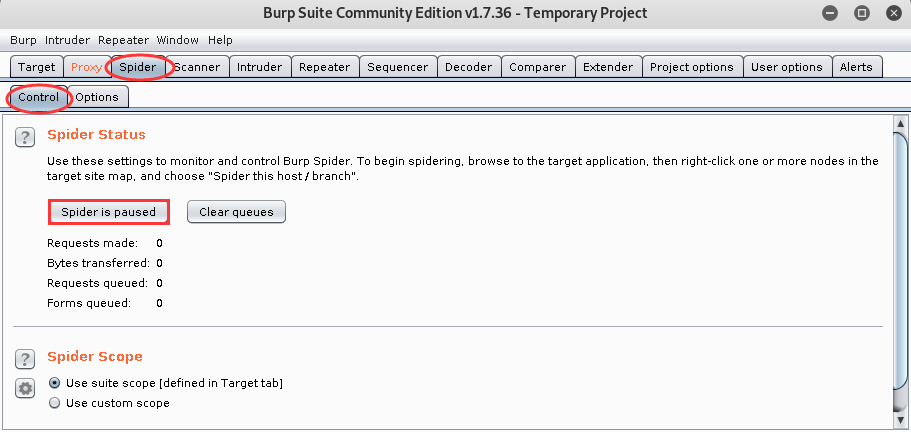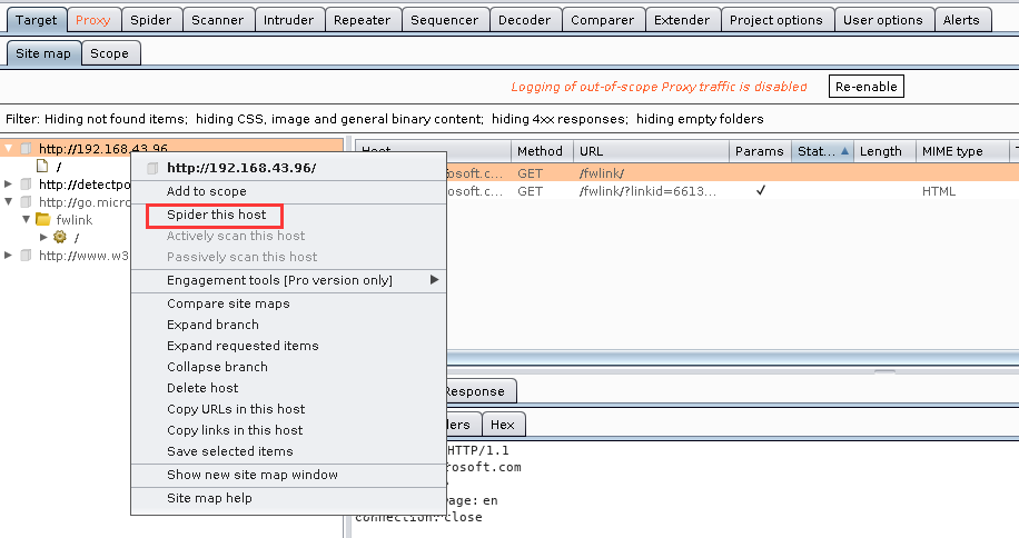 注:打开Burp Suite,根据前面Target中的有关配置,选中要测试的页面链接,右击目标网站,选中“Spider this host”命令;