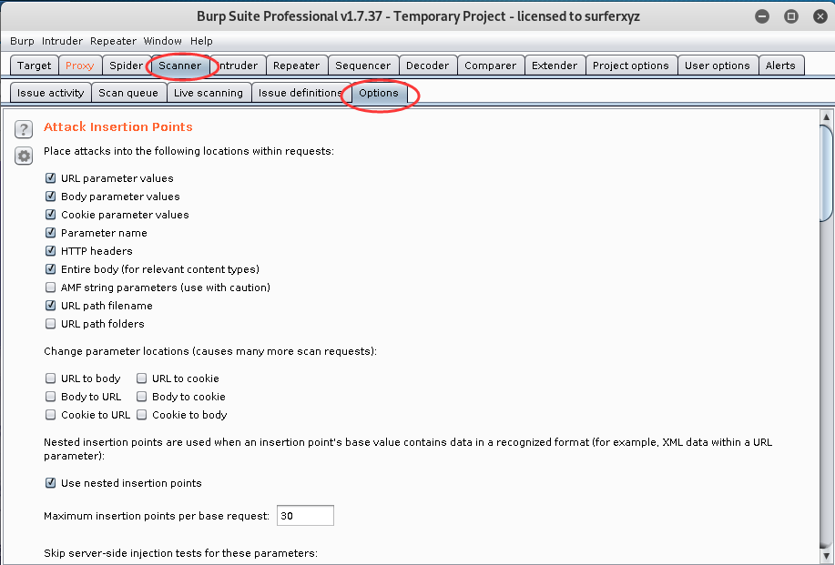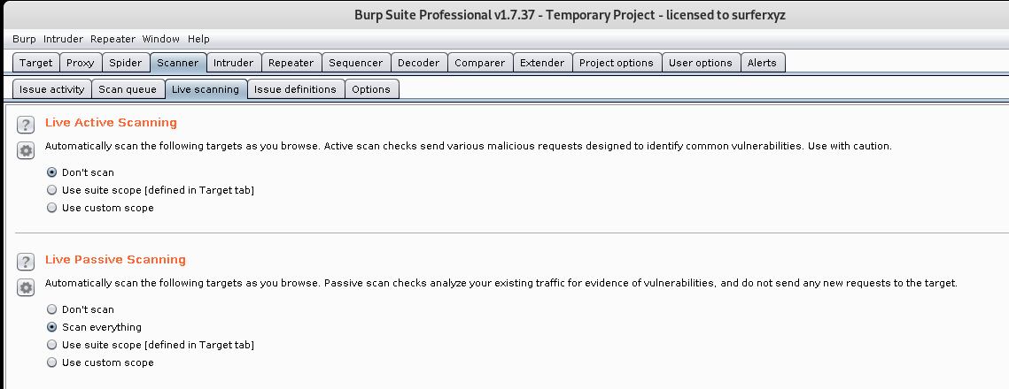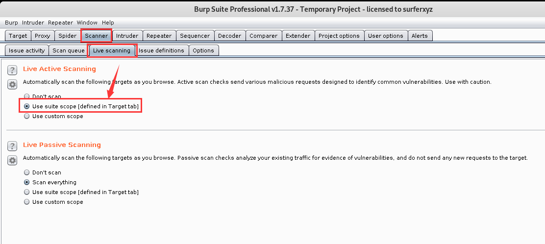 5.2.4、进入“Scanner”选项卡的“Live scaning”子选项卡,在Live Active Scanning中选择“Use suite scope[defined in Target tab]”单选按钮,Brup Scanner将自动扫描经过Brup Proxy的交互信息;