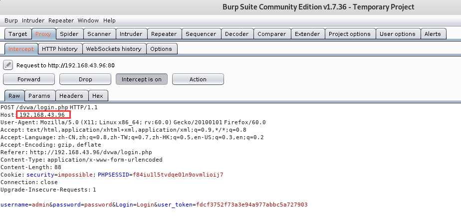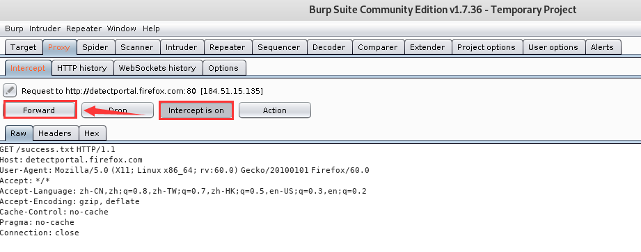 2.3.3、在Burp Suite中单击forward按钮,可以看到拦截的数据;