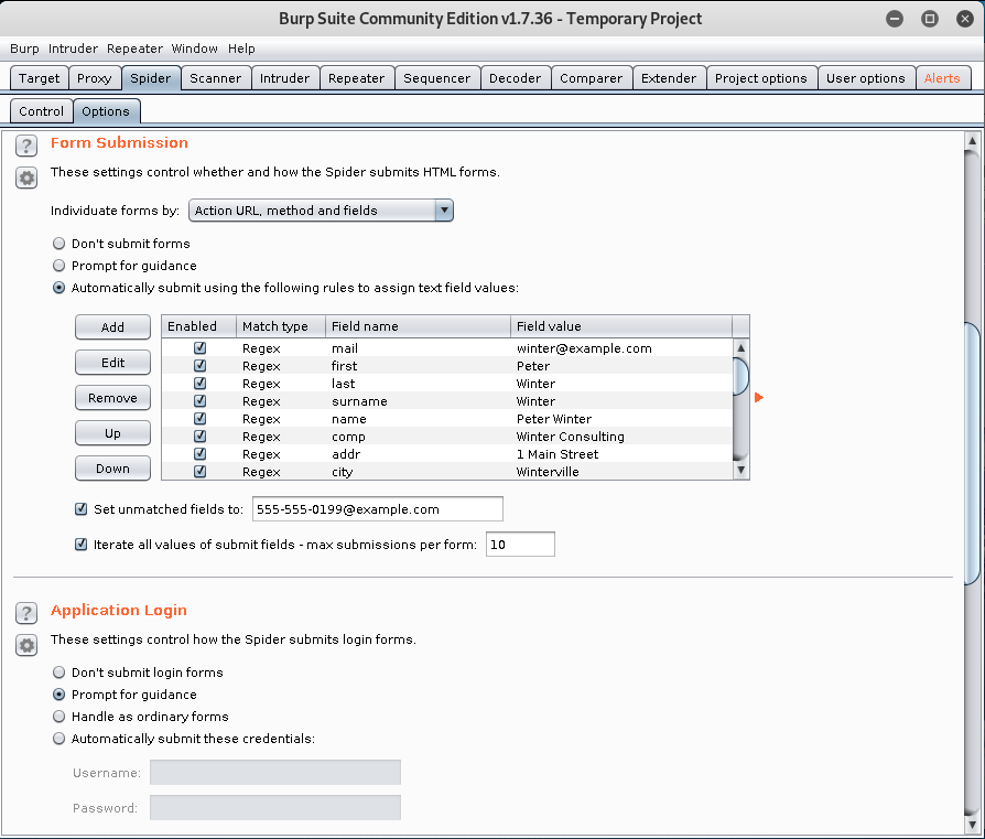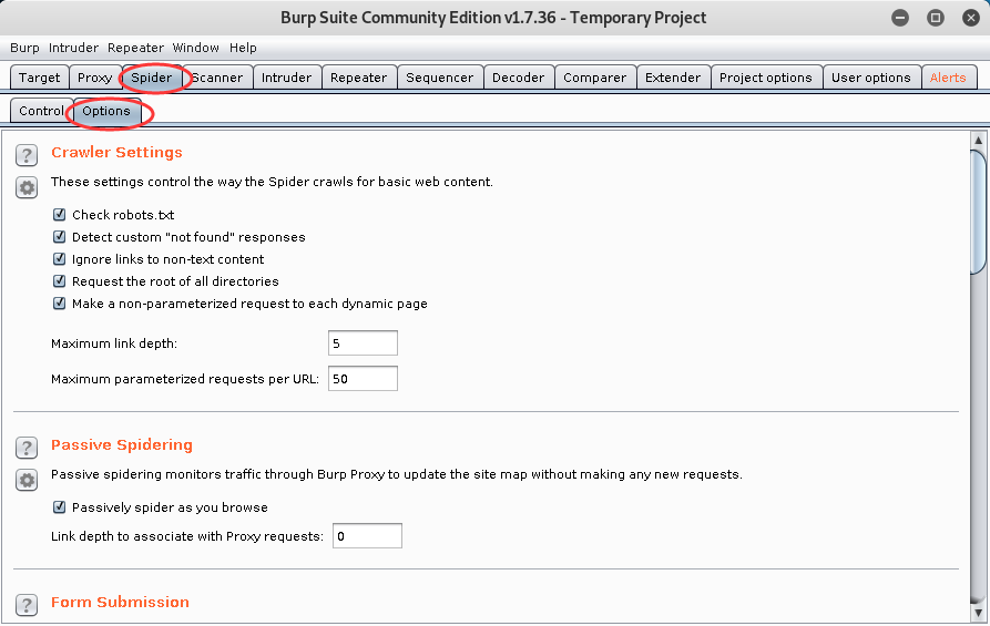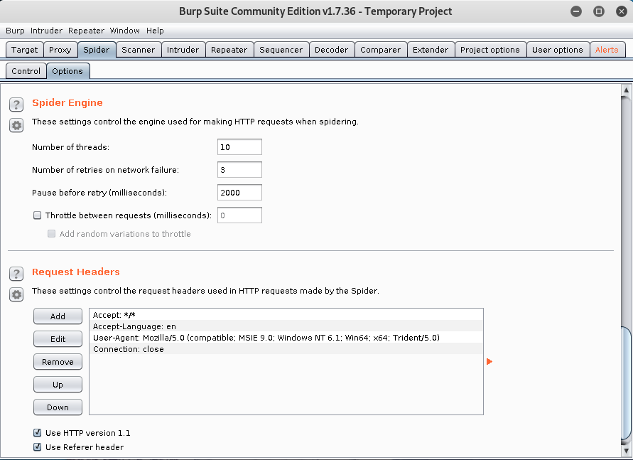 注:对“Spider”选项卡下的“Options”子选项卡的有关选项取默认配置;