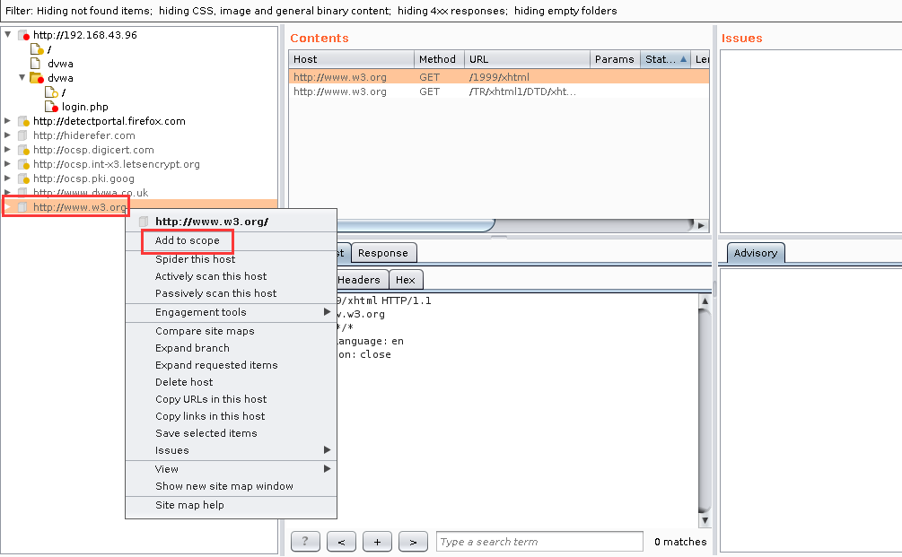 5.2.3、在 “Target”选项卡的“Site map”子选项卡中选中需要添加的网址,单击鼠标右键,在弹出的快捷菜单中选择“Add to Scope”命令,将给网址添加到作用域中,然后进行自动扫描;
