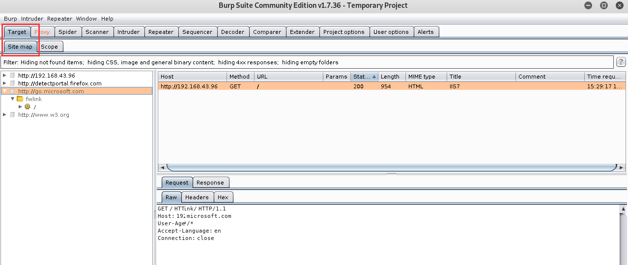 注:启动Burp Suite,打开“Target”→”Site map”选项卡。