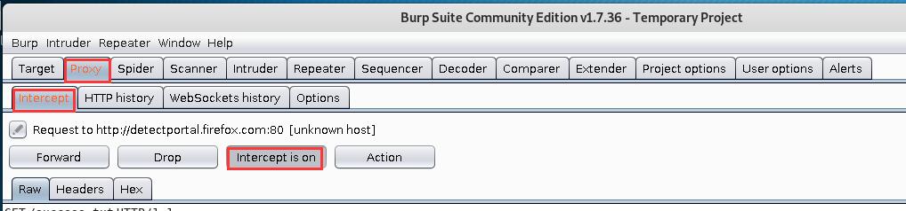 2.3.1、在kali中打开intercept子选项卡,开启数据包拦截功能;
