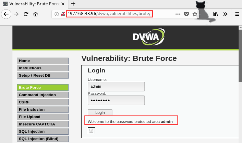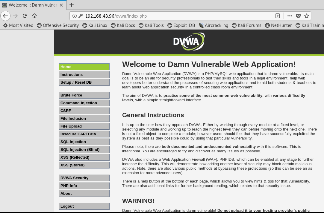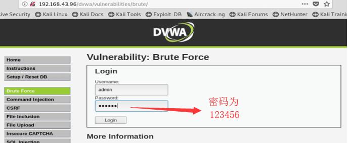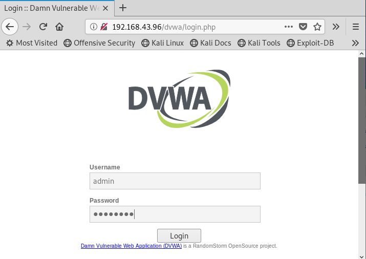 6.1.2、用浏览器访问网站http;//192.168.43.96/dvwa,以渗透测试系统dvwa 为靶机站点;