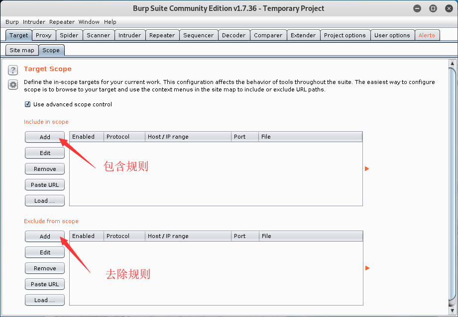 注:Target Scope目标域规则设置,打开“Scope”子选项卡;
