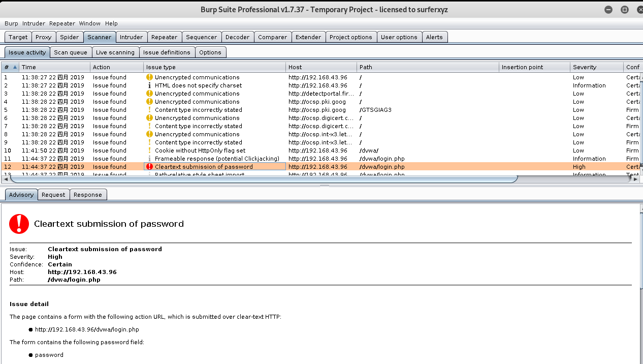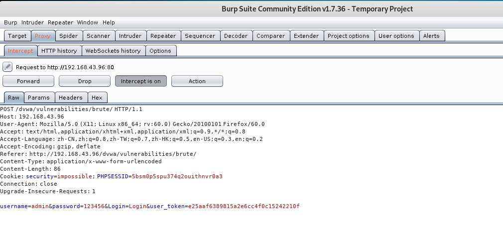 注:在Burp Suite中单击forward按钮,可以看到拦截的数据