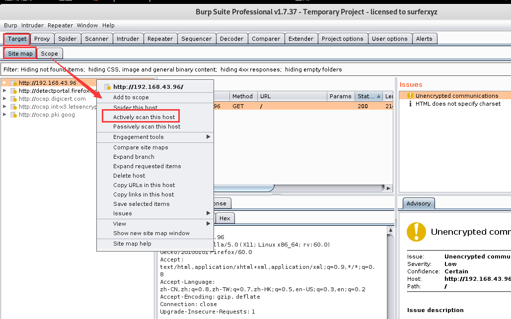 5.1.1、启动Burp Suite,正确配置Burp Proxy并设置浏览器代理,同时在“Target”选项卡的“Site map”子选项卡中配置好要扫描的域和URL模块路径,右击需要扫描的站点,选择快捷菜单中的“Actively Scan this host”命令;