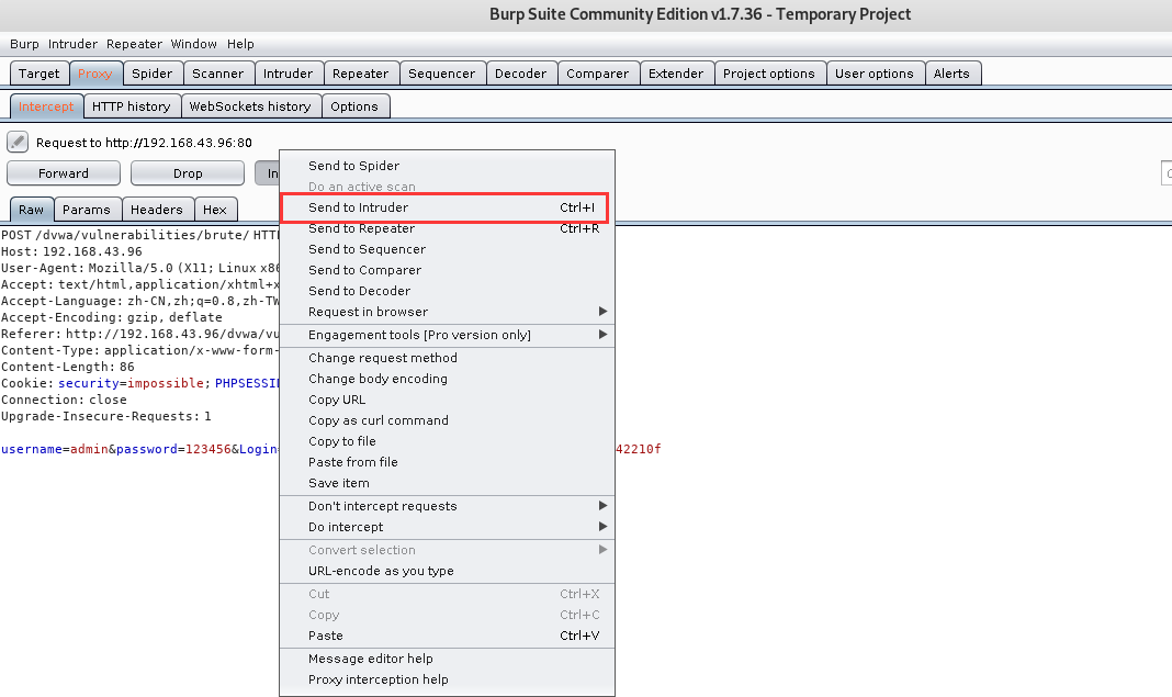 6.1.5、选中所有数据并在右键快捷菜单中选择“Send to Intruder”命令;