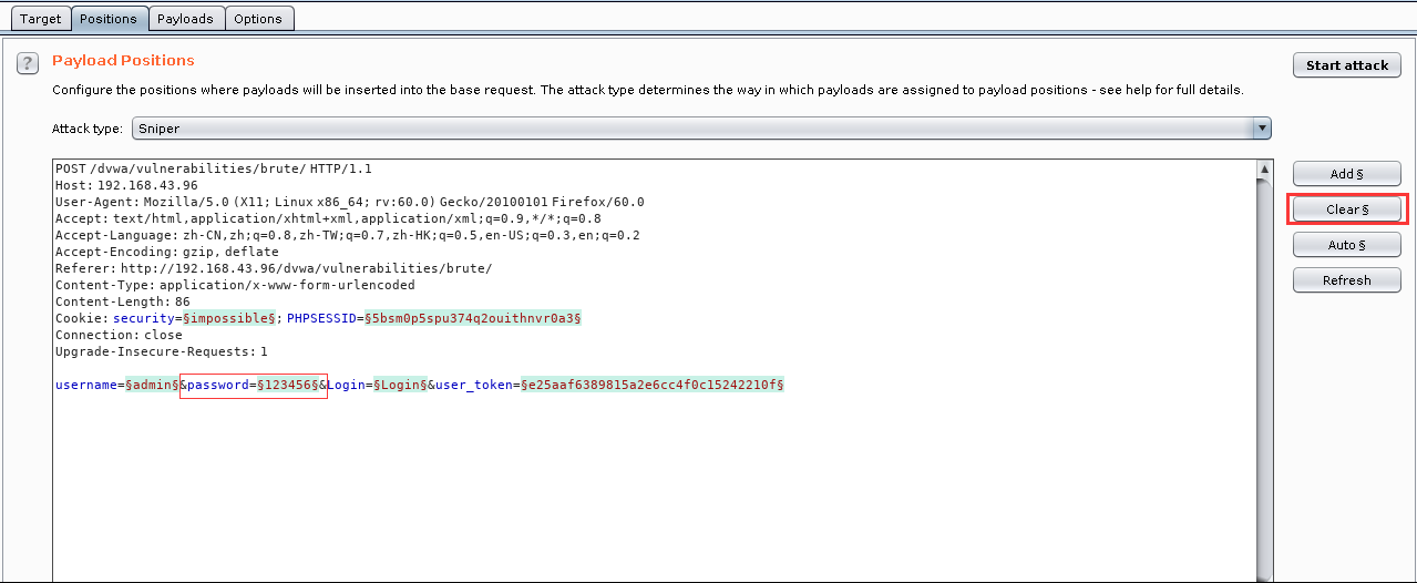6.1.7、对图中自动标记的变量进行爆破,单击右边的“Clear§”按钮,然后选中密码后面的123,在添加为爆破变量;