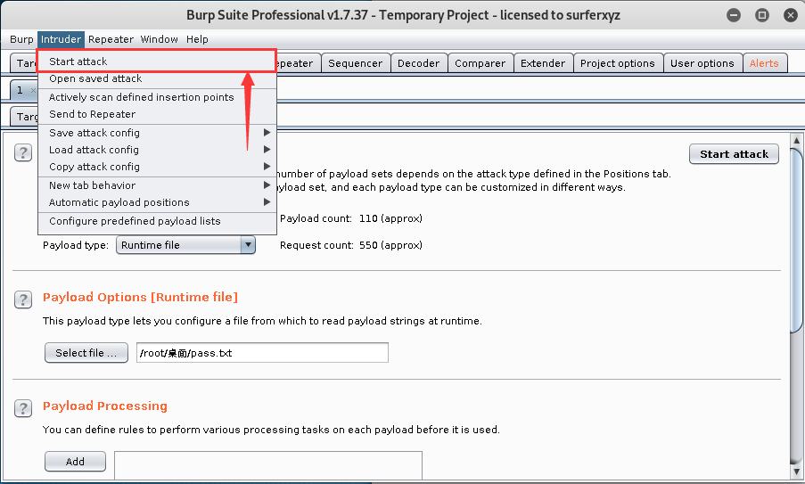 6.1.9、设置完成后,单击Brup Suite中的“Intruder”菜单项,选择“Start attack”命令;