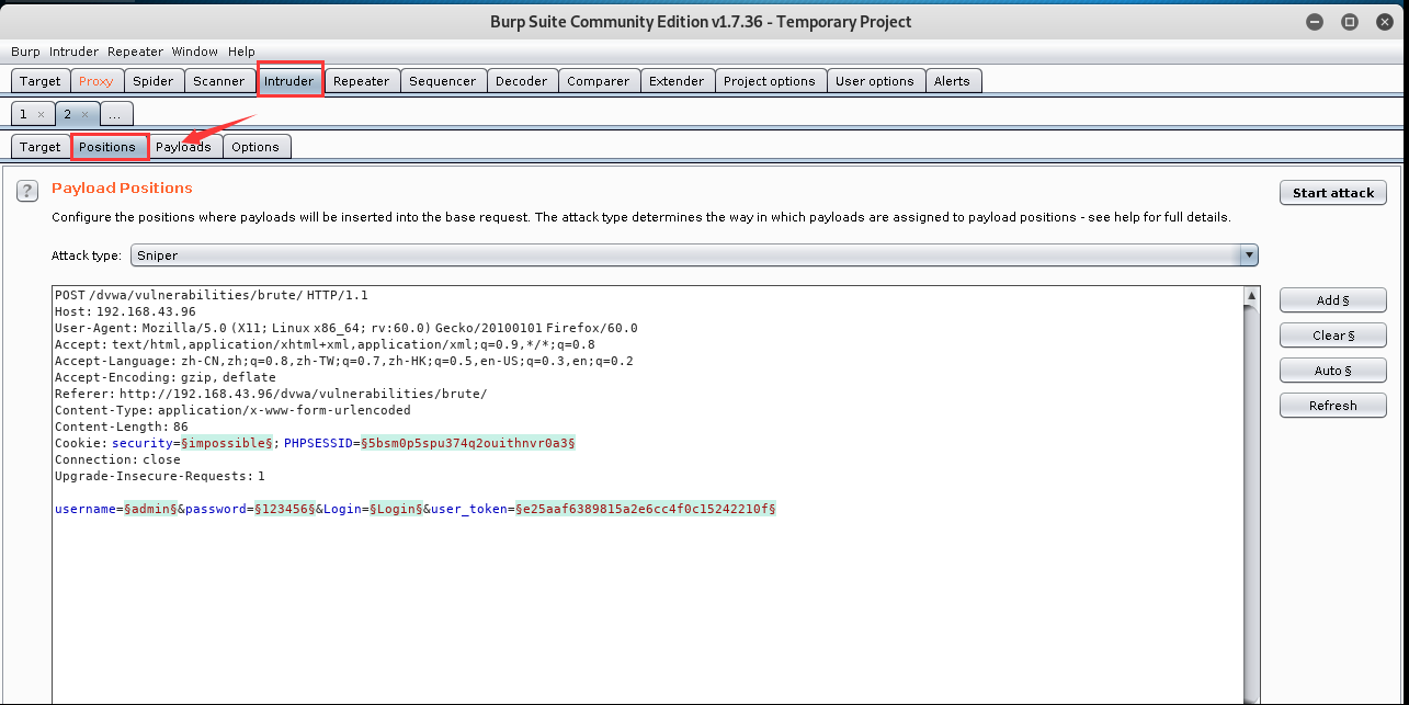 6.1.6、选择“Intruder”选项卡,并选择“Positions”;