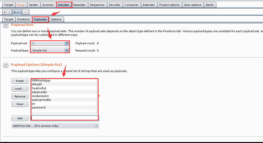 6.1.8、选择“Intruder”选项卡,并选择“Payloads”子选项卡,对爆破变量所需的密码文件进行配置;