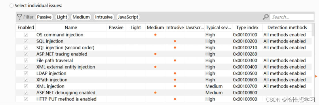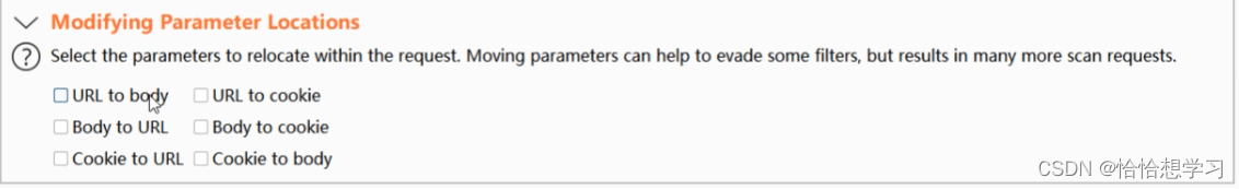 | Insertion Point Types | 插入点的类型 | URL参数值,Body里面的参数值,Cookie值参数名字,HTTP请求头,Body完整内容,URL文件名,URL目录 |