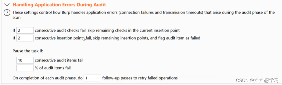 | Handing Application Errors During Audit | 审计过程出错的处理 | 比如连接失败和传输超时默认:如果一个插入点连续失败了两次,就跳过,不再发送请求(接口挂了) 如果连续两个插入点失败,跳过其他的插入点(网站挂了) |
