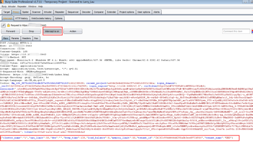 2. 登录平台,点击新建集群按钮,输入相关必填项,点击确定后,查看BurpSuite是否拦截到http请求的url和body。(因为已设置代理,所以页面操作会一直loading,相关下发数据均被BurpSuite拦截)