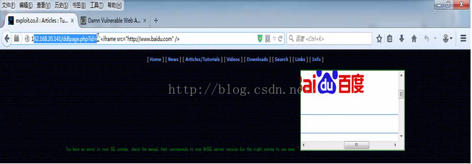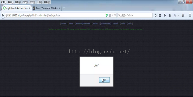 通过url的输入,我们能在页面中显示出来,那我们是否可以构造一个js脚本,我们来看一下效果。能够弹出一个警告框,说明跨站脚本攻击漏洞存在