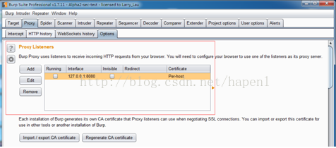 BurpSuite开启后,默认已经创建了代理地址及端口127.0.0.1:8080 。在【Proxy】->【Options】->【Proxy Listeners】,如下图所示:
