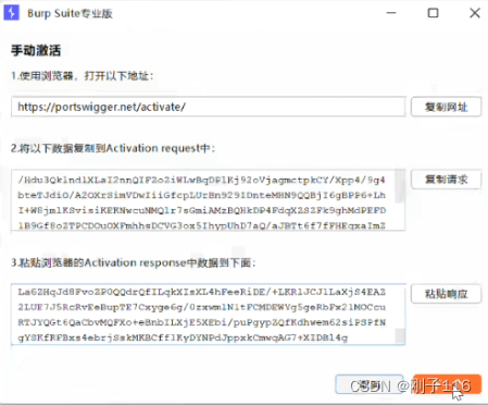将注册机中License复制粘贴 到Burp Suite专业版位置点击下一个,之后点击手动激活