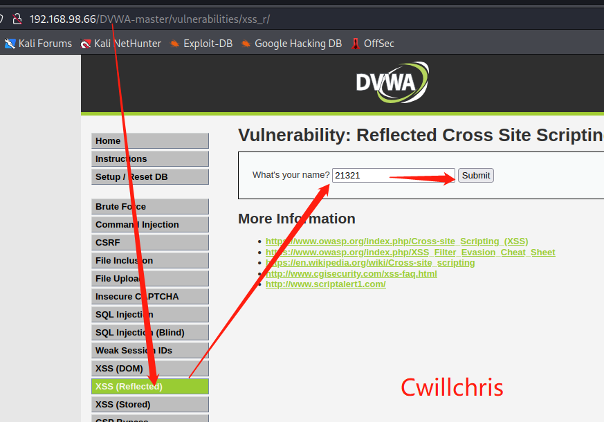 在火狐中访问: 192.168.98.66/DVWA-master/vulnerabilities/xss_r/