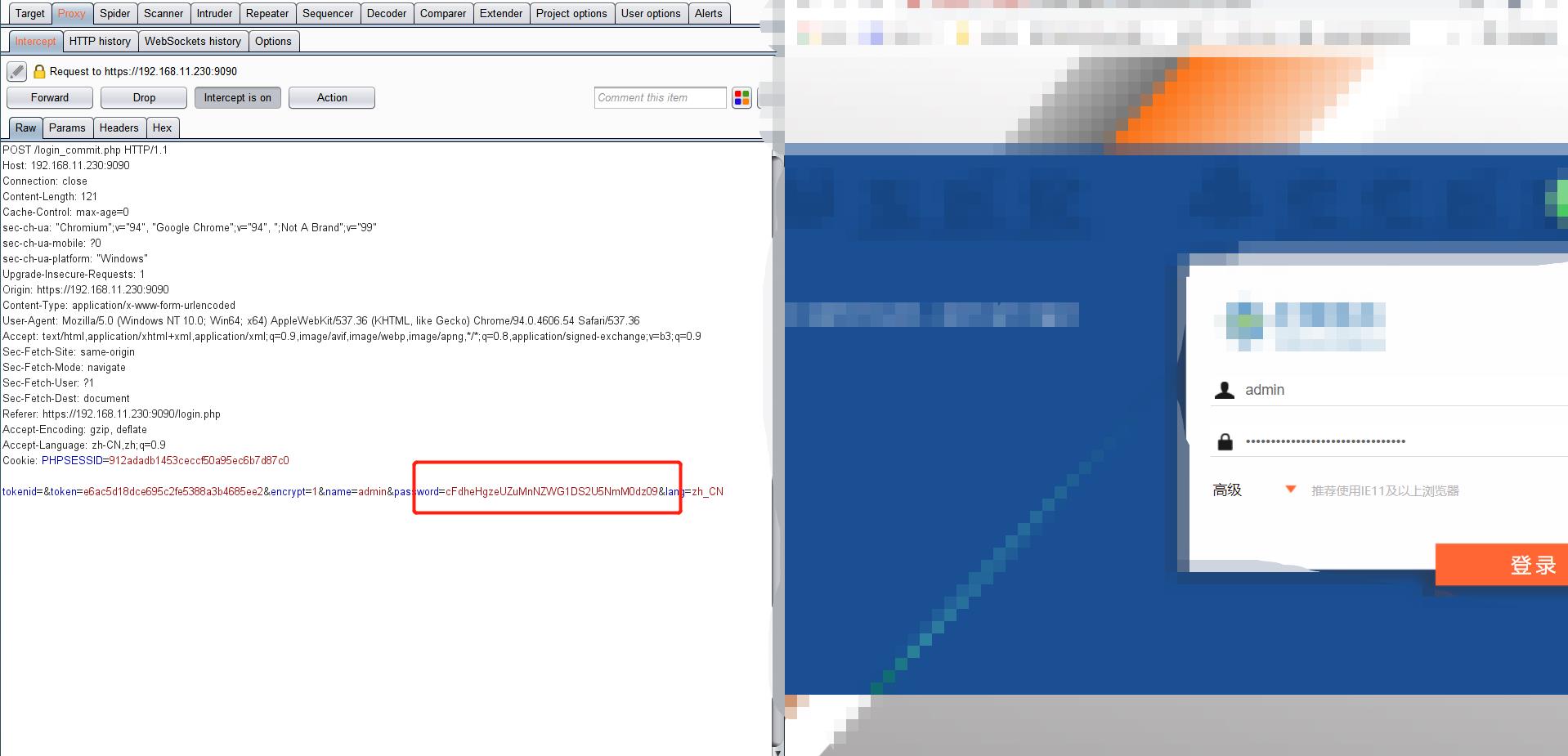 打开之后我们从网页登录页面 ,输入账号密码之后点击interept is on 就会拦截到,如果有这个漏洞的话,下面红色圈起来的就是密码,正常情况下就是加密的密文;