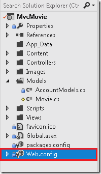 您刚创建的MovieDBContext类用来连接数据库,并将Movie对象映射到数据库表记录。你可能会问一个问题,如何指定它将连接到那个数据库。通过在应用程序的Web.config文件中添加数据库连接信息来指定连接到那个数据库。