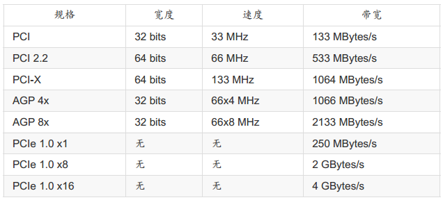 显卡主要也是通过CPU的控制芯片来与CPU、内存等沟通。显卡也是需要高速运算的一个元件,所以数据的传输也是越快越好!因此显卡的规格由早期的PCI导向AGP,近期AGP又被PCI-Express规格所取代了。这些插槽最大的差异是在数据传输的带宽!如下所示: