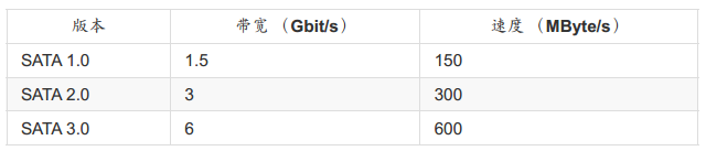 因为SATA传输接口传输时,通过的数据演算法的关系,当传输10位编码时,仅有 8位为数据,其余2位为检验之用。因此带宽的计算上面,使用的换算(bit转Byte)为1:10而不是1Byte=8bits!虽然这个SATA3接口理论上可达600MBytes/s的传输速度,不过目前传统的硬盘由于其物理组成的限制,一般极限速度大约在150~200MByte/s,所以厂商们才要发展固态硬盘。