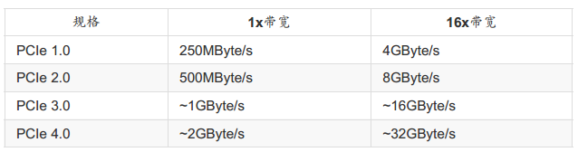 比较特殊的是,PCIe(PCI-Express)使用的是类似管线的概念来处理,在 PCIe 第一版(PCIe 1.0)中,每条管线可以具有250MBytes/s的带宽性能,管线越多(通常设计到x16管线)则总带宽越高!另外,为了提升更多的带宽,因此PCIe还有进阶版本,目前主要的版本为第三版,相关的带宽如下: