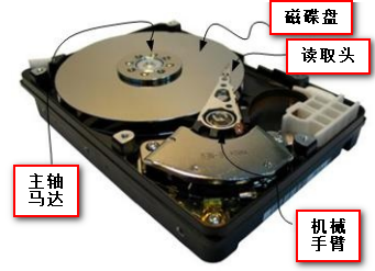 实际的数据都是写在具有磁性物质的盘片上头,而读写主要是通过在机械手臂上的磁头(head)来达成。实际运行时,主轴马达让盘片转动,然后机械手臂可伸展让磁头在盘片上进行读写的动作。另外,由于单一盘片的容量有限,因此有的硬盘内部会有两个以上的盘片!