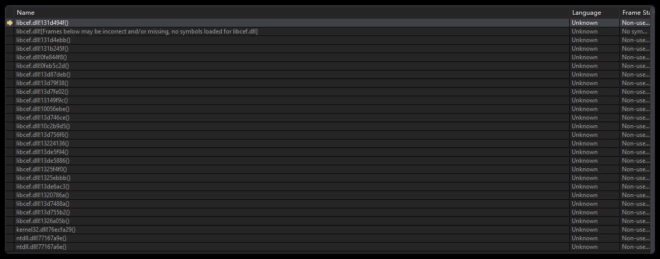 最后我想到了一个法子,我记得libcef有pdb文件可以看更详细的堆栈信息。立马下载了对应的pdb文件,解压放到libcef.dll同目录下。一个pdb文件就有3G大小,