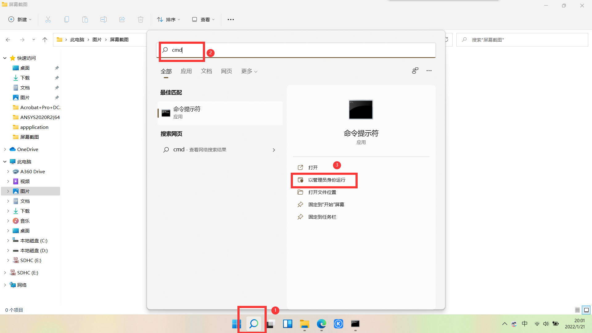 则需要在任务栏的搜索框中输入cmd,鼠标右击或在右侧的框中,点击以管理员身份运行。