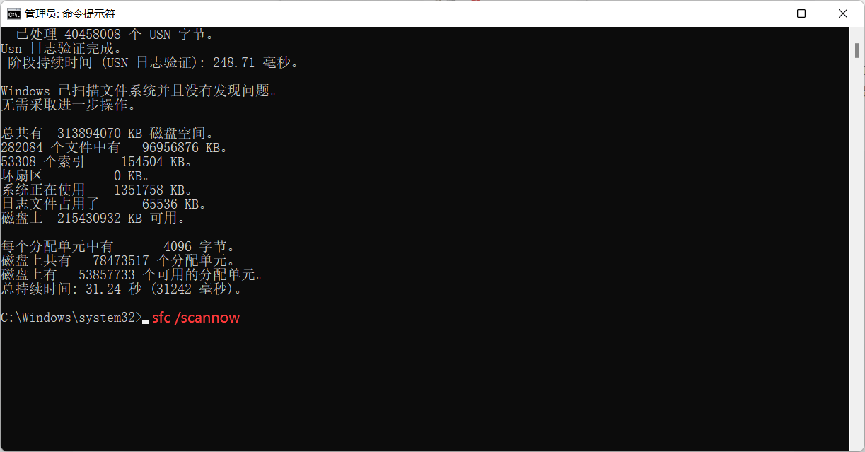 3.输入并运行完chkdsk之后,再输入sfc /scannow ,按回车开始运行,运行结束后重新开机即可。